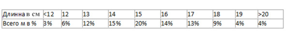 Согласно российским исследованиям, средняя длинна полового члена из множеств выборок составляет около 13 см с диаметром 2,5 см. При этом наиболее часто встречаются следующие крайние цифры, характеризующие его длину: 12 – 18 см, 12,5 – 17,5 см, 13,8 – 16,6 см. В 1998—2002 году И. Кон опросил 8267 человек старше 18 лет, и по его данным составлена следующая таблица: