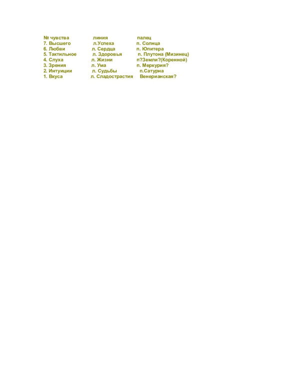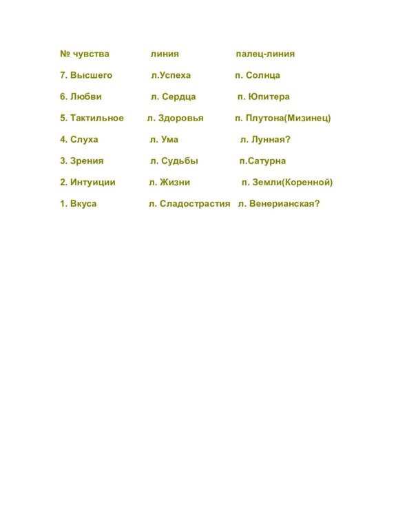 О том, как в Земных условиях (если это повлияло) на Чувстве-нности могло выразиться, нужно смотреть на карте Хиромантии – ладони в последовательности Главных линий: Сладострастия (пояс Венеры) – Вкус; Судьбы (Сатурна) – Интуиции (Зрения?); Ума (Меркурий) – Зрение; линия Слуха?; Линия Сердца (Юпитера) – Любви; линия Счастья (Солнца) – Высшее; линия Здоровья (Плутоноиды) – Тактильное? А линия Жизни (Земля) – также или заместо? Мы так и не имеем чёткого распределения Планет по линиям скорее всего потому что Психологические понятия использовали в Жидкостно-Чувственной субстанции, где бы нужно смотреть по доморощенным названиям линий. Разве что Пальцы в недостаточности своей до полного 7 соответственно подходящим к ним линиям получили обозначения по Планетам и линиям, но похоже связи может совсем не быть. 20 пальцев на руках и ногах вместе с 4 теми вместе у Человека были Материализованы от Психологического численного состава. Сами руки трёхсоставны.