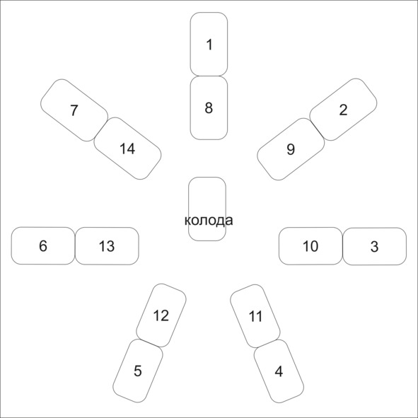 Итак, перемешайте колоду думая о вопросе. Положите ее в центр перед собой. Вытащите 7 карт и разложите их по кругу, как указанно на рисунке.