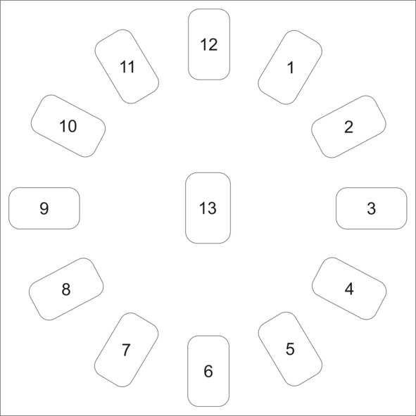 Итак, вечером под новый год перемешайте колоду. И разложите по кругу в том порядке, в котором указанно на рисунке.