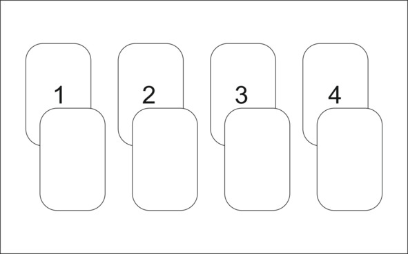 Перемешайте эти четыре карты и положите в ряд рубашками вверх.