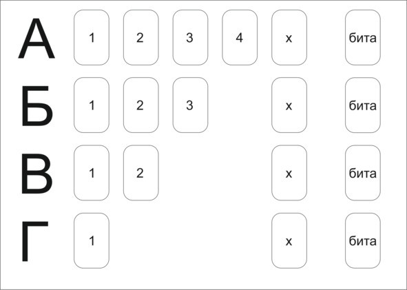 Этап Г. Теперь переложите карты в одну стопку, чтобы их порядок стал ровно наоборот. Дальше снимите все до карты Х и положите в биту.