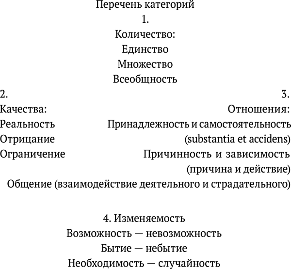 Я намеренно опускаю определение категорий, хотя легко бы дать его. Впоследствии я сделаю анализ их в той мере, в какой он требуется учением о методе. В системе чистого разума я не мог бы уклониться от сего требования; здесь же оно отвлекало бы от главного пункта моего исследования, возбуждая сомнение и возражение; поэтому дело это можно отложить, нисколько не вредя тем главной цели. Из моих немногих слов уже видно, что полный словарь понятий со всеми нужными разъяснениями не только возможен, но и легко выполним. Отделы уже готовы; нужно только наполнить их; систематическая топика вроде моей легко может указать настоящее место каждому понятно и наметить, где место остается незанятым.