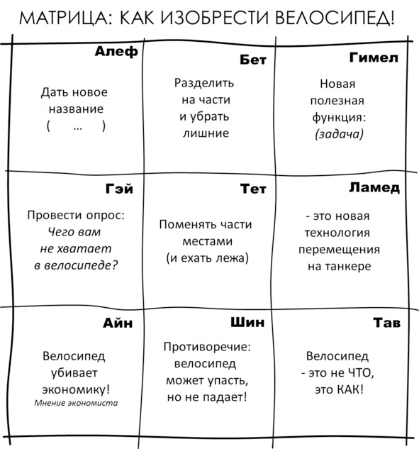 Первый прием #Алеф про название (явления, ситуации или матрицы) дал ответ: Если вы хотите изобрести велосипед не изобретайте его, а просто придумайте ему новое название! И надо отметить, что рекламщики большие мастера создавать и придумывать новые названия! #Бет – разделить на части, уменьшить количество деталей, поменять некоторые детали или исключить. #Гимел – изобрести новую функцию, которую велосипед может выполнять и т. д., до пилотажных приемов #Шин – поиск и разрешение противоречий, например, велосипед который находится в равновесии и не может упасть. #Тав – измерения и онтология, в случае этого приема велосипед может быть не объектом (Что?), а местом (Где?) или процессом, ответом на вопрос: Как?
