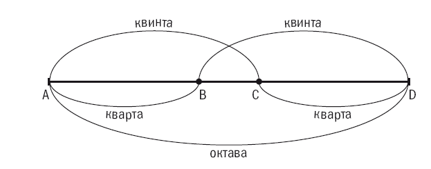 Три консонансных интервала определенным образом организуют звуковой континуум. Чтобы увидеть это, представим три голоса – обозначим их А, С, D. Пусть интервал между А и D составляет октаву, а между А и С – квинту. Все три голоса будут создавать консонанс. При этом оказывается (также эмпирический факт), что интервал между С и D составляет кварту. Оказывается, таким образом, что октава представляет собой сумму двух других консонансных интервалов. Взяв далее еще один звук – В – образующий с А кварту, мы установим в пределах октавы некоторую систему интервалов. Звук В отличается от D на квинту. Октава оказывается разделена на последовательность интервалов четырьмя голосами: А, В, С, D. Интервалы между этими голосами графически изображены на рис. 1.