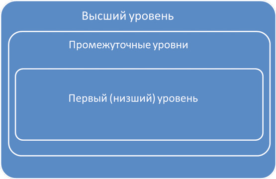 2. Уровневая структура представляет систему в виде схемы взаиморасположения уровней ее формирования. Уровневую структуру можно рассмотреть, как правило, только, после выяснения самого процесса создания системы.