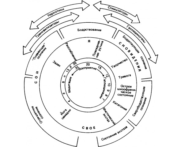 Карта внутреннего пространства (по Фишеру, 1971—1975), представляет состояния сознания в континууме восприятие-медитация (слева) и в континууме восприятие-галлюцинация (справа).