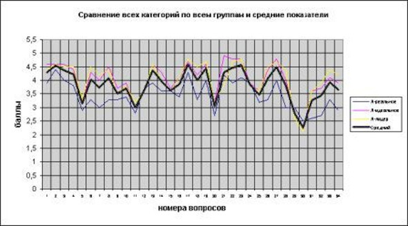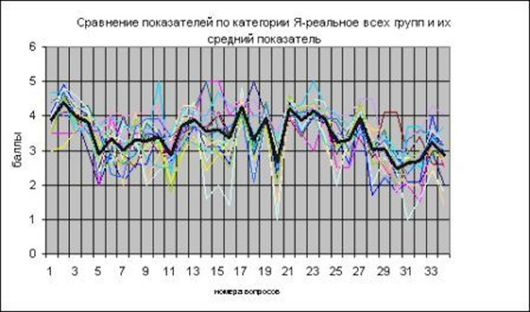 Теперь посмотрим на обобщающую диаграмму №2. На ней представлены средние показатели по всем группам и по всем категориям. Наиболее темный график показывает средний профиль по всем категориям личности (Я-реальное, Я-идеальнои и Я-лидер).