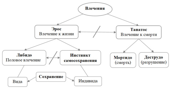 Зигмунд Фрейд предложил в качестве двигателя, побуждающего человека к действию, влечение – стремление к удовлетворению неосознанной или слабо осознанной потребности. Согласно Фрейду, влечение находится «где-то на границе» между душевным и физическим. Бывает так, что нас влечет к чему-то, и мы до конца не понимаем к чему и зачем. Вот такое влечение и есть одно из первичных проявлений потребности. В классическом психоанализе влечение описывается четырьмя параметрами: источником, целью, объектом и силой. Как видим, здесь употребляются уже знакомые нам понятия. Источник влечения – это процесс в организме, который в психическом плане проявляется как влечение. Можно сравнить его с потребностью. С тем, что такое цель, мы тоже уже знакомы. Можно сказать, что в понятии влечения объединяется и потребность, и мотив, и цель. Изначально в своей практике Фрейд акцентировал внимание на влечении к жизни. Его он условно разделял на libido, что с латинского переводится как похоть, желание, страсть, стремление и инстинкт самосохранения. Он противопоставлял либидо и инстинкт самосохранения, как стремление к сохранению вида и сохранению индивида. Часто бывает так, что эти влечения конкурируют между собой, вступают в конфликт и противоречие. Ученица Фрейда Сабина Шпильрейн, практикуя психоанализ, выделила еще одно влечение – к смерти, которое объяснило поведение некоторых пациентов. Возникла новая, более выраженная оппозиция. Давайте изобразим эти противоречия на одной схеме.