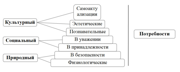 Абрахам Маслоу разделил все выраженные, не похожие друг на друга потребности, которые можно обнаружить, на семь групп – кластеров и выделил наиболее распространенную вероятную их иерархию. Автор считал, что иерархия потребностей не является фиксированной и зависит от конкретной личности с ее непредсказуемым внутренним миром, а также от культуры, в которой человек развивался. В оригинальной статье даже нет изображения пирамиды, которая появилась несколько позже. Вот она, наиболее распространенная иерархия. Думаю, в таком порядке потребности будут располагаться у девяноста процентов населения земного шара. Сразу распределим семь групп потребностей по трем уровням: природный, социальный и культурный. Думаю, такая классификация очень пригодится нам далее.