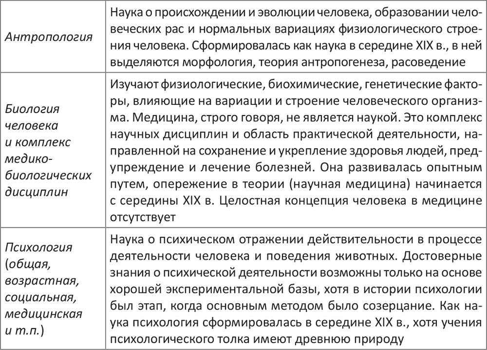 Человека изучают многие науки. Это не удивительно, потому что люди очень интересны сами по себе. Но науки эти достаточно изолированы друг от друга, каждая из них имеет своим предметом лишь какую-то одну сторону в многообразии человеческих проявлений. Однако для целостного представления о человеке знания, добытые конкретными науками, необходимы. Что же это за науки и как они представляют человека? Назовем некоторые из них (табл. 1.2).