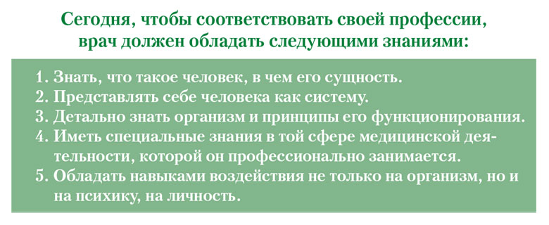 И здесь эти потребности изменившегося человека наталкиваются на то, что каждый узкий специалист в медицине занят своей областью, продолжает видеть в человеке организм, а не личность. Это происходит потому, что ни одна медицинская дисциплина не дает целостного представления о человеке. Но медицинские дисциплины и не должны этим заниматься, иначе исчезнет их предмет. Человек в зеркале медицины предстает в мозаичной форме. Кроме того, в медицинских науках преобладают знания о патологии, тогда как представления о норме носят условный характер и служат в основном как сравнительный материал.