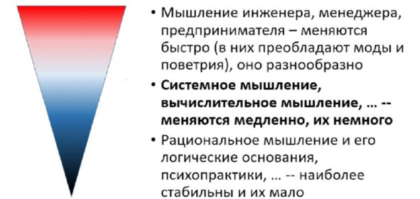 Но сразу освоить эти предметные мышления, да ещё потом и сочетать мышления для разных деятельностей не удаётся, ибо разные наборы мыслительных компетенций, часто называемые различными «мышлениями» (вычислительное мышление, системное мышление, инженерное мышление, танцевальное мышление и т.д.) могут быть выстроены в некоторое подобие пирамиды, поставленной на свою верхушку: немногое количество базовых видов мышления у острия пирамиды поддерживают большое количество находящихся над ними предметных видов мышлений.