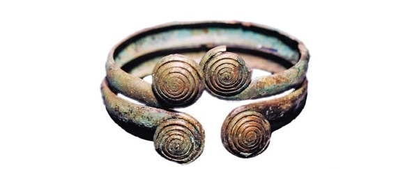 pic.17 Lobule ring and open bracelet. Orenburzhye, SHM, Moscow Reconstruction of the image of the inhabitants of Arkaim. The temporal lobular rings on the woman on the right.