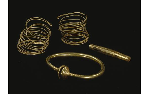 pic.19 Sacrificial contribution: includes two spiral rings on the hand, an open ring resembling rings of the same type of Abashev culture and Sintashta culture and a gold bar from Frederiksborg County.