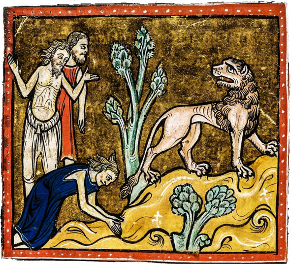 «Когда лев ходит, не движется прямо вперед и не позволяет следам своим оставаться видимыми и понятными, но идет то вперед, то назад, то придерживается одного направления, то выбирает противоположное. Затем он ходит туда-сюда, заметая свои следы, чтобы охотник не смог его преследовать и с легкостью обнаружить его логово, где он отдыхает и живет со своими детенышами. Эти привычки льва суть особый дар природы». – Элиан О природе животных IX.30.
