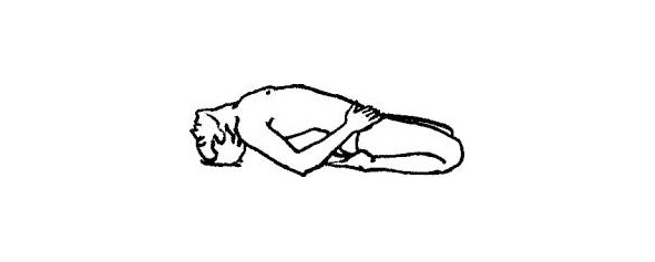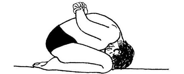 С помощью локтей, выгибая грудь, опускаем туловище назад, пока теменем не опустимся на пол. Ладони сложены на груди пальцами вверх, дышим произвольно.