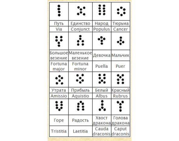 В случае, когда оставалась одна точка (знак), предсказание считалось неблагоприятным, предвещающим разочарование, потери и прочие напасти; два оставшихся знака сулили счастье, успех и удачу.