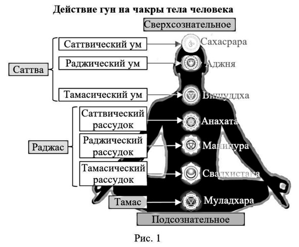 Давайте изобразим гуны внешней природы на рисунке 1. Здесь мы видим, что каждое качество гун воздействует только на свою определённую чакру. Только все три качества Тамаса действуют через одну чакру Муладхару, но можно сказать и так, что в этой чакре одновременно присутствует три типа «антенн» для «приёма» трёх качеств Тамаса. Итого мы получаем девять точек подсоединения гун внешней Природы к человеку. Каждая чакра настроена только на свою «волну» определённого качества гуны, вернее имеет некий диапазон волн, соответствующий только ему. Это и определяет наш характер и тип действия во внешнем мире.