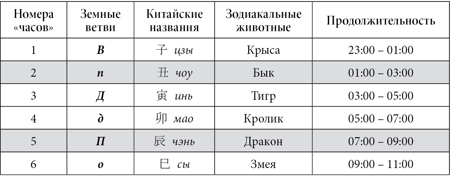 Таблица 5 показывает названия «часов» и их продолжительность. Во второй колонке вы видите соответствующие часам земные ветви в моей кодировке, которая отражает их стихии и модальность (Ян – заглавная буква, Инь – строчная). Земным ветвям соответствуют двенадцать всем известных «зодиакальных животных». По этим животным часто называют годы, месяцы, дни и часы ТКК.