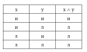 Таблица истинности коньюнктивного суждения, состоящего из двух простых суждений, выглядит так: