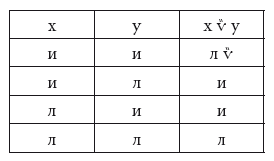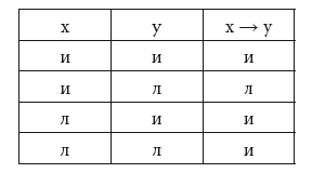 Затем ячейки в столбцах, показывающих возможные значения простых суждений, заполняются символами «и» (вариант, когда простое суждение оказывается истинным) и «л» (когда оно ложное) таким образом, чтобы в строках сочетания «и» и «л» с одной стороны, не повторялись, с другой – чтобы отразить все возможные сочетания «истинности» и «ложности» простых суждений в данном сложном.