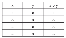 Так, суждение «Студент на семинаре по логике демонстрирует хорошую теоретическую подготовку или проявляет умение решать практические задачи» ложно только тогда, когда оба простые суждения («Студент… демонстрирует хорошую теоретическую подготовку» и «Студент… проявляет умение решать практические задачи») ложны, а в остальных случаях – истинно.