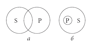 Частноутвердительные суждения («Некоторые S суть Р») – частные по объему субъекта и утвердительные по качеству связки. Например: «Некоторые судьи – выпускники РАП». В этих суждениях субъект и предикат представляют перекрещивающиеся понятия. Их объемы частично совпадают, оба термина нераспределенные (см. рис. 8а).