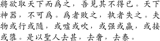 1. В начальной строке словосочетание вэй чжи имеет значение «нарочно воздействовать на что-либо». Такое внешнее воздействие противоположно даосскому идеалу «неделания» как действия изнутри, чистой действенности действия. Последний знак и обычно трактуется как служебное слово, которое обозначает конец предложения. Согласно толкованию Хэшан-гуна (Ван Би оставляет эту фразу без комментария), «тот, кто хочет управлять людьми, не сможет обрести Небесный Путь и людские сердца». Между тем Су Чэ предлагает совершенно иную трактовку: он полагает, что мудрый правитель (в соответствии с наставлениями древних даосов) должен управлять, делая лишь то, чего «не может не делать», и потому он «не может не принять мир под свое правление». Первую же часть фразы на этом основании он понимает в том смысле, что правителю «вручают мир на царствие». Это толкование откровенно противоречит следующей строке, но Су Чэ толкует ее в том духе, что правитель в действительности не воздействует на мир.