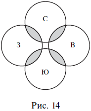 3. Результаты деления не должны пересекаться, т. е. понятия, представляющие собой результаты деления, должны быть несовместимыми, их объемы не должны иметь общих элементов (на схеме Эйлера круги, соответствующие результатам деления, не должны соприкасаться). Например, в делении Страны мира делятся на северные, южные, восточные и западные допущена ошибка – пересечение результатов деления. На первый взгляд, приведенное деление кажется безошибочным: оно проведено по одному основанию (сторона света) и является полным (все стороны света перечислены). Чтобы увидеть ошибку, надо рассуждать так. Возьмем какую-нибудь страну, например Канаду, и ответим на вопрос, является ли она северной. Конечно, является, так как расположена в северном полушарии Земли. А является ли Канада западной страной? Да, потому что она расположена в западном полушарии. Таким образом, получается, что Канада – одновременно и северная, и западная страна, т. е. она является общим элементом объемов понятий северные страны (С) и западные страны (3), а значит, эти понятия пересекаются. То же самое можно сказать и относительно понятий южные страны (Ю) и восточные страны (В). На схеме Эйлера результаты деления из нашего примера будут располагаться так (рис. 14).