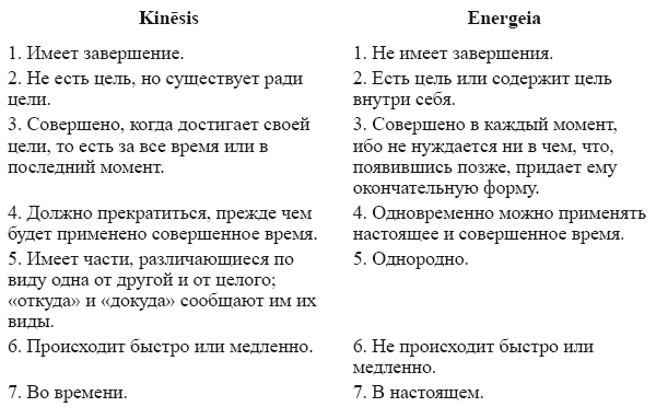 Аристотель делает именно такой вывод в знаменитом пассаже из Метафизики IX.6, когда проводит различение между energeia и движением или изменением (???????) (1048b18-34). Он повторяет примеры из Евдемовой этики и добавляет некоторые другие: с одной стороны – строительство дома, лечение, ходьба, похудание и обучение; с другой стороны – видение, размышление, понимание, хорошая жизнь, счастье. Действия первого типа суть движения, так как каждое имеет предел (?????) и потому не является само по себе целью, но направлено на цель. Действия второго типа – это energeiai, так как каждое есть цель или, иначе, так как цель в нем заключена (????????? ?? ?????)) (1048b22). В силу этой фундаментальной разницы два этих класса примеров отличаются также и с помощью грамматического теста. Необходимо прекратить совершение действия первого типа, чтобы можно было сказать, что оно совершено, например, нужно прекратить строить дом, чтобы можно было сказать, что дом построен. И наоборот, человек в одно и то же время видит и увидел, думает и подумал, живет хорошо и уже жил хорошо.
