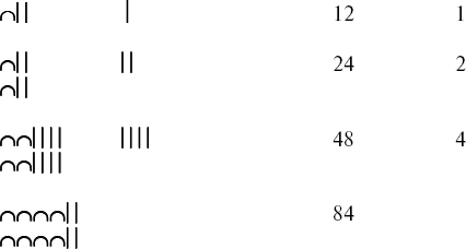 Знаки-символы могут использоваться, во-первых, для тех же целей, что и знаки-модели (например, счета), во-вторых, для осуществления различных формальных операций (умножение, деление, сложение, вычитание и пр.), в-третьих, они подобно знакам-символам могут стать самостоятельными объектами. Рассмотрим одну иллюстрацию – использование египетских чисел для пересчета военного отряда, построенного в 7 шеренг, в каждой из которой стоит по 12 воинов. Сначала египетский писец пересчитывает количество шеренг и число воинов в каждой шеренге. Затем перемножает число 7 на 12 (в древнем Египте умножение осуществлялось путем многократного сложения и удвоения чисел). Слева я записал операцию умножения, как она делалась в Египте, а справа для понимания современными числами: