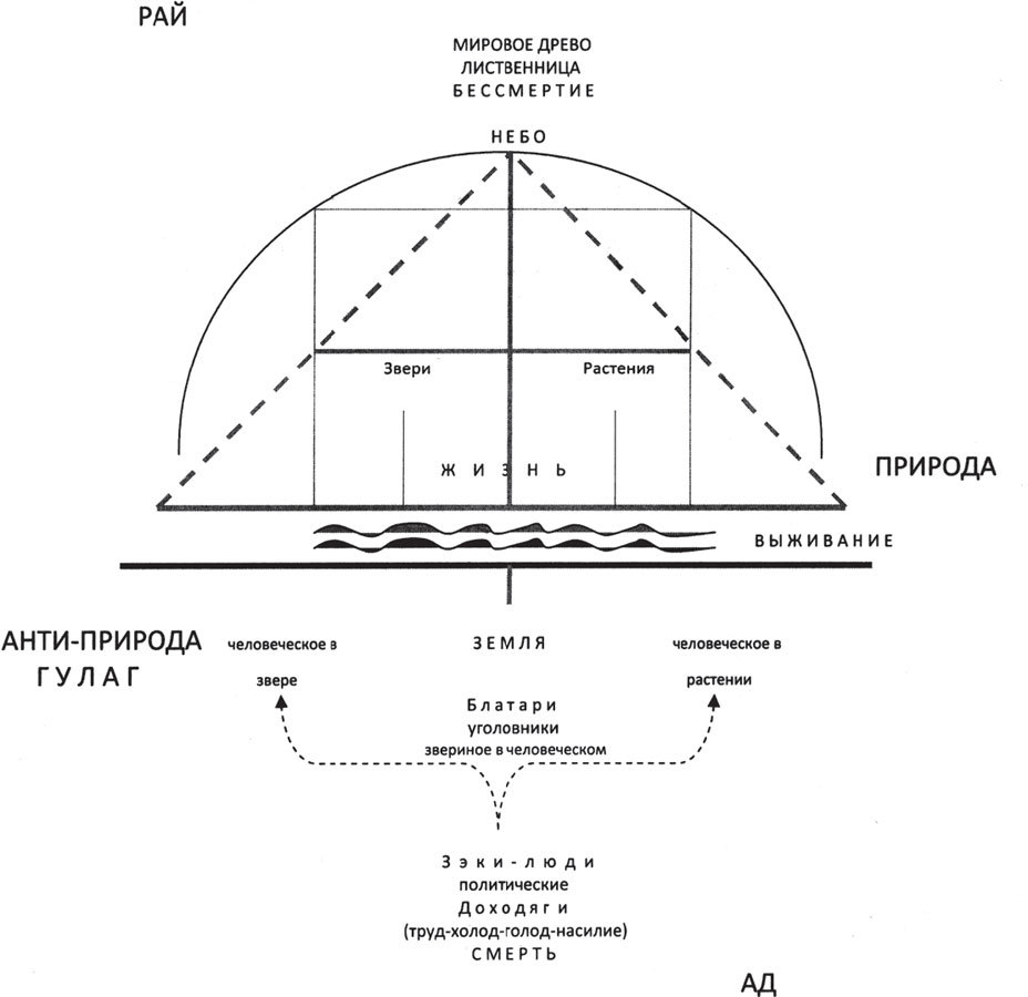 Правда, стоит помнить о том, что перед нами реконструкция видения (оптика) того, что принадлежит исключительно В. Ш. Мир В. Ш. делится на три отображенных в нашей диаграмме части: В центре ЛИСТВЕННИЦА — главный конструктивный символ шаламовского мира — она вертикализует и связывает между собой эти раздельные миры: ПРИРОДЫ и АНТИ-ПРИРОДЫ (ГУЛАГа), между которыми хрупкая и неширокая лента ВЫЖИВАНИЯ, где доходяги гибнут, а придурки полны надежд, мир почти разрушенной человеческой жизни, зависимый от верхнего и нижнего миров. Небесный купол ПРИРОДЫ — там действует фактор бессмертия, вечного движения и изменения, мертвого сна и пробуждения, тлена и воскресения; он получает поддержку от мощной горизонтали «зверей», «растений», «камня», «воды» и «льда»; в мире природного бытия нет смерти, — там лишь переходы к новой форме жизни. Нижний мир — мир АНТИ-ПРИРОДЫ (ГУЛАГа). Там мы находим жителя лагеря зэка, пытающегося сохранить шанс на выживание в «это» мгновение, «сейчас», не «сегодня» или «завтра»[116]. Это мир напрасного и полностью обесцененного труда, труда гулаговских рабов[117].
