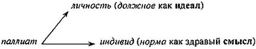 Паллиат в прямом значении латинского слова palliatus ‘одетый в плащ’ — индивидуум в ризах личности. Паллиат — это человек, т. е. социальный индивид. Однако скольжение взгляда изменяет не структуру культурной парадигмы, а доминантность совмещенных категорий: «В каждой цивилизации присутствуют все три слоя. Разница лишь в доминанте» [Там же: 285]. Блуждающий нерв категории сохраняет все типы в пространстве инварианта, создает внутреннюю динамику дальнейшего развертывания парадигмы, давая выбор предпочтений. Утроенность имен производит впечатление растроенности парадигмы, включенной в концепт на правах такого инварианта, но, в конце концов, это всего лишь слова, слова, слова... за которыми скрыта сущность, непозволительная для смертного, который блуждает в этих трех соснах, покрытый темным плащом воображения.