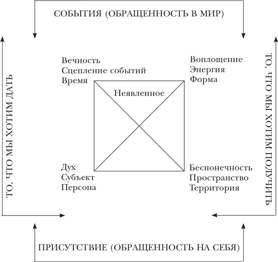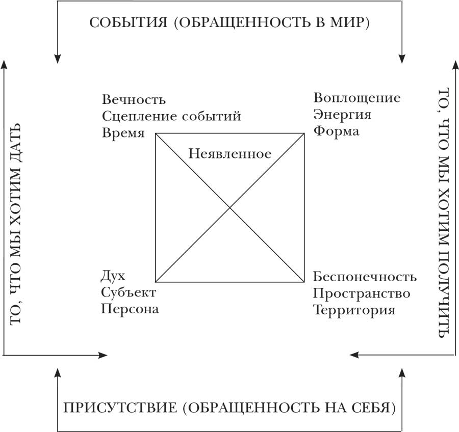 Пространство сознания – это тоже дитя неявленного. Форма – это упаковка неявленного. Исходным интеллектуальным инструментом будет так называемое Большое целое. Инструмент построен на базе такого сделанного, как метод качественных структур И. Н. Калинаускаса, который существует в двух формах – в форме векторной структуры и в форме квадрата аспектов, который сформулирован совместно с Г. Рейниным. Это разные вещи, и ими надо по-разному пользоваться.