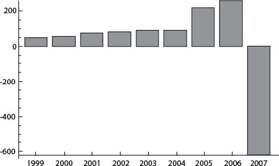 Рис. 8. Indy Mac, компания, потерпевшая банкротство во время кризиса ненадежных кредитов (Taleb 2009). Пример характеризует риски, которые при отсутствии убытков постоянно увеличиваются – вплоть до внезапной катастрофы