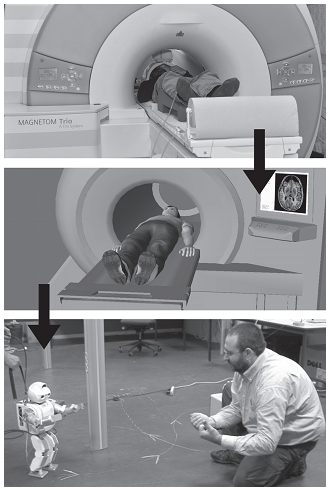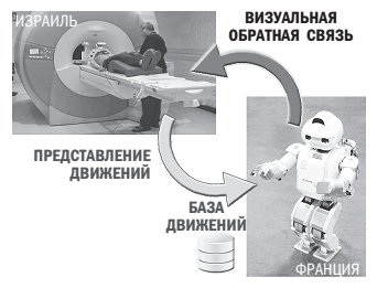 Наши израильские коллеги Ори Коэн и Дорон Фридман с сотрудниками из Франции показали, что при использовании функциональной магнитно-резонансной томографии возможно считывать намерение к действию. Затем его можно напрямую переводить на уровень моторных команд человекообразного робота, который преобразует их в телесные действия, в то время как испытуемый наблюдает за экспериментом глазами робота20. Этот процесс основан на порождаемых волевым усилием зрительных представлениях движения, позволяющих испытуемому, «действуя прямо из я-модели»21, удаленно управлять со сканера в Израиле роботом во Франции.
