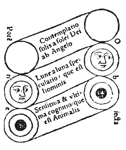 Представь, что из соединения Бога и Ангела и их взаимного сближения здесь получается нечто, подобное человеческому Мышлению, там – весьма подобное человеческому объекту, в одном случае луна, в другом – диада. Ведь после того, как Ангел принят в Боге, и Бог закрыт и затенен ангельским облаком, Он таким способом становится доступным человеческому созерцанию и зрению и делается объектом человеческого ума. Ибо если ангельским объектом является простой и неприкровенный Бог, то человеческим – сокрытый и затененный Бог. Если Ангел видит Бога, как солнце, то есть чистым, несмешанным, не имеющим формы, то Человек видит Бога, как луну, то есть Бога, окутанного ангельским облаком и ангельской формой, в котором уже прежде запечатлен (insitus) ангельский лик. Как только божественная форма воспринята в ангельском Мышлении, и ангельское Мышление заполнено (mixtus) божественной формой и отмечено (insignis) ею, возникает нечто, подобное человеческому Мышлению.