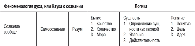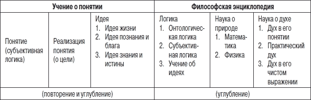 Подбор основных частей энциклопедии обоснован Гегелем так: логика есть наука о чистом понятии и абстрактной идее; природа и дух составляют реальность идеи, первая – как внешнее наличное бытие, второй – как «знающий себя». Другими словами, логическое есть вечно простая сущность в себе самом; природа есть эта же сущность как отчужденная; дух же есть возвращение этой сущности в себя из своего отчуждения.