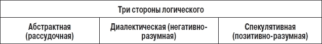 Гегель приобщает учащихся к этим трем сторонам логического. Рассудочность не идет дальше понятий в их твердой определенности и различии. Диалектичность показывает эти понятия в их переходе, в их превращении друг в друга. Спекулятивность или разумность, схватывает единство понятий в их противоположности или же позитивное – в его разложении и переходе.