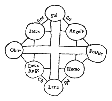 Действительно, ангельская способность Мышления и ее объект, и то и другое – чистые, естественные, простые и несмешанные, подобно монадам и солнцам. Человеческое же Мышление, равным образом и его объект, оба они смешанные и сокрытые, подобно диадам и лунам, которые, как мы показали[456], образуются благодаря естественному сочетанию двух первых монад и солнц. Поскольку ангельское Мышление смешивается с божественной формой, оно становится подобным человеческому Мышлению, несущему печать божественной формы. Поскольку же Ангел находится в Боге, затеняя Бога своим туманом, он завершает объект человеческого Мышления.