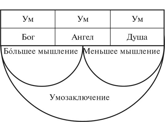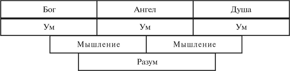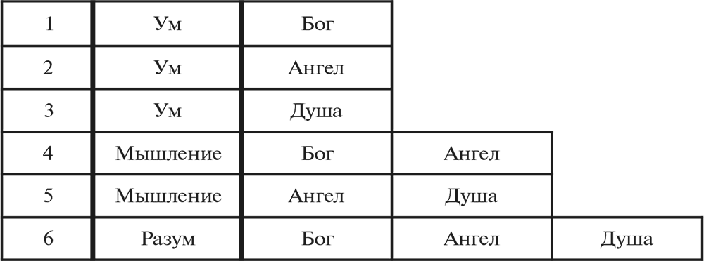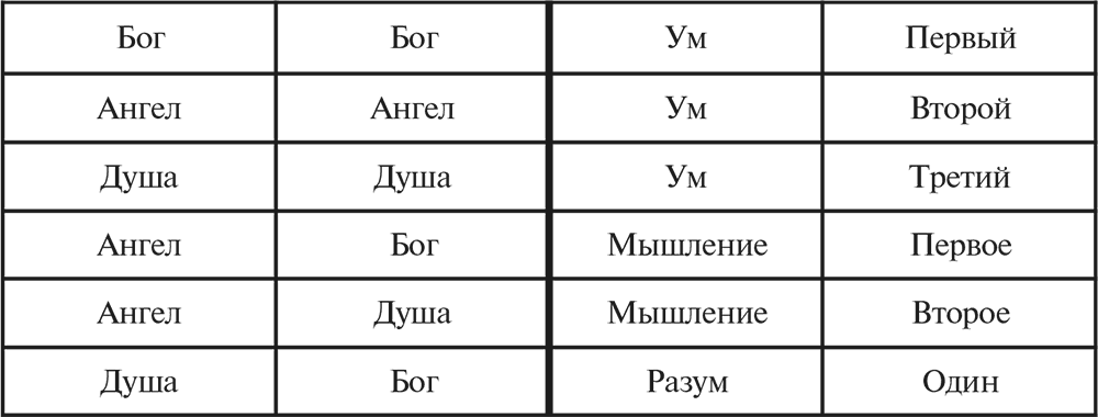 Так и Ум заключается в простом единстве и в точке [соединения] субъ-екта и объекта; Мышление – в их двоичности и в линии; Разум – в их троичности и в плоскости. Ибо сии три точки в отдельности: Бог, Ангел, Душа – суть три Ума. Две же эти линии: Бог – Ангел и Ангел – Душа – суть два Мышления. При этом сии три: Бог, Ангел, Душа, будучи одной плоскостью, составляют единый Разум или опосредствованное познание Бога. Его начало, откуда оно распространяется – Душа; середина, через которую осуществляется движение света, – Ангел; искомый же предел – Бог.