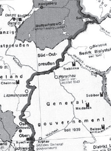 Расположение шести «лагерей уничтожения»: Хельмно, Треблинки, Собибора, Майданека, Бельжеца и Освенцима. Хельмно считается из них самым мелким и «незначительным»