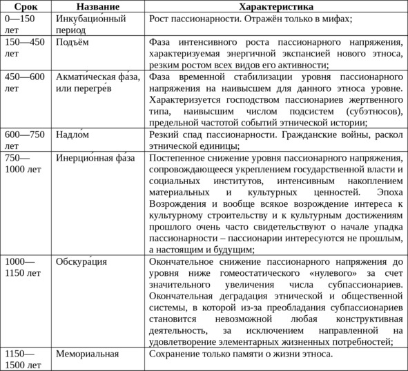 Как видим, время существования этноса составляет в среднем около 1200 лет, после чего он исчезает, специализируется (например, евреи, цыгане) или становится реликтовым (например, малые народности Севера и Дальнего Востока). Гумилев признавал, что вместе с развитием внутри- и межэтнических коммуникаций смены фаз могут ускоряться.