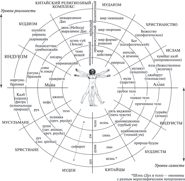На рис. 4.1 изображена традиционная Великая цепь бытия, простирающаяся от тела до ума, души и духа. По сути своей данная иллюстрация аналогична рис. 3.3 и 3.4 (стр. 78 и 79). Поскольку каждый более высокий уровень превосходит, но включает более низкий уровень, нужно в действительности говорить о Великом гнезде бытия, как указано на этой иллюстрации. На самом деле Великая цепь бытия – это Великая холархия бытия. Это изображение Великого гнезда заимствовано из книги Хьюстона Смита «Забытая истина: Общее видение религий мира». Можно утверждать, что Хьюстон Смит является величайшим из живущих авторитетов по мировым религиям, а «Забытая истина» содержит сделанное им обобщение основополагающих сходств, разделяемых великими мировыми традициями духовной мудрости. На рис. 4.1 просто отражен факт, что каждая из великих религиозных систем признает ту или иную вариацию тела, ума, души и духа. Это чудесный и простой обзор традиционного религиозного мировоззрения, встречаемого буквально по всему миру. На рис. 4.2, тоже составленном под руководством Смита, предложено несколько примеров.