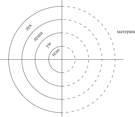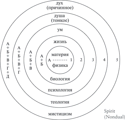 Рис. 4.3. Великая холархия. Дух есть одновременно и высший уровень (причинный), и недвойственное основание всех уровней