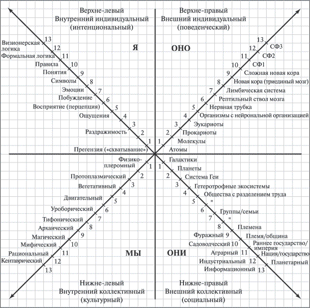 Общая идея довольно проста. Возьмем, к примеру, сложную новую кору (неокортекс) мозга человека (пункт 10 на рис. 4.4). Ее можно описать внешним, объективным, научным языком (ряд борозд, расположенных на внешнем слое мозга, которые состоят из различных нервных тканей, нейромедиаторов и нейронных проводящих путей). В этом случае получаем верхне-правый квадрант, Однако, когда в мозге человека впервые развилась сложная новая кора, собственно и дифференцировавшая его от приматов, это соответствовало переходу от внутреннего бежевого мема к внутреннему пурпурному мему (магическое мировоззрение): иными словами, произошло изменение не просто объективной структуры мозга, а также и субъективного сознания – от бежевого к пурпурному, в процессе чего старое архаическое мировоззрение уступило место магическому мировоззрению. Эти внутренние изменения в индивидуальном (верхнелевый квадрант) и коллективном (нижне-левый квадрант) измерениях также отображены на иллюстрации. И наконец, коллективная группа первобытных людей, если ее описать с точки зрения внешних (материальных или социальных) форм, перешла от бежевых группировок, ориентированных на выживание, к этническому племенному строю (как показано на рис. 3.1 и 4.4).