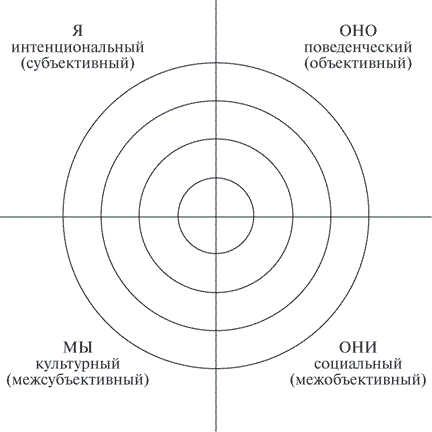 Отметьте, что на рис. 4.4 два верхних квадранта отображают единичные, или индивидуальные, феномены, а два нижних квадранта – множественные, или коллективные, феномены. Два левосторонних квадранта отражают внутреннее, или субъективное, измерение, а два правосторонних квадранта – внешнее, или объективное, измерение.
