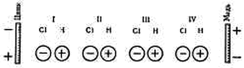 Если теперь в разбавленную соляную кислоту погрузить цинковую и медную пластинки, то мы можем предположить, что цинк обладает более сильным притяжением к электроотрицательной составной части ее (Cl), чем к электроположительной (H). Благодаря этому прикасающиеся к цинку молекулы соляной кислоты должны были бы расположиться таким образом, чтобы обратить свои электроотрицательные составные части к цинку, а свои электроположительные – к меди. Так как расположенные таким образом составные части воздействуют своим электрическим притяжением на последующие молекулы HCl, то весь ряд молекул между цинковой и медной пластинками примет такое расположение, какое указано на следующем рисунке: