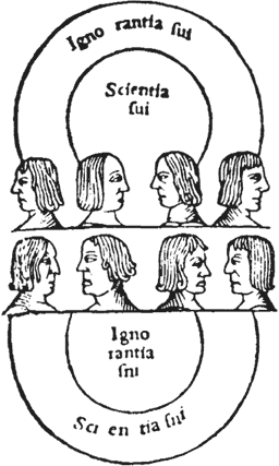 В одном случае крайние лики находятся спиной друг к другу, смотрят наружу и в противоположные стороны, средние же обращены друг к другу и смотрят друг на друга. И таким образом одновременно изображаются незнание и знание, Неразумие и Мудрость Мудреца, ибо посредством крайних ликов обозначается Неразумие, посредством же средних – Мудрость.